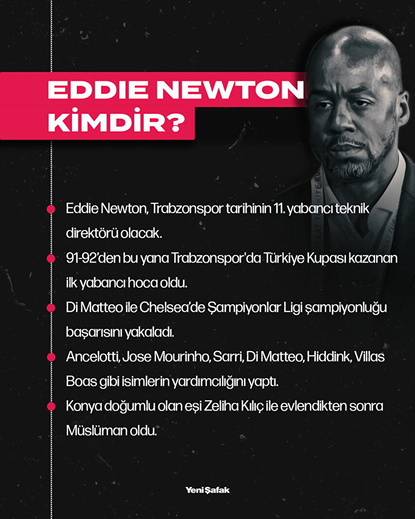 - Chelsea’de Carlo Ancelotti, Jose Mourinho, Maurizio Sarri, Roberto Di Matteo, Guus Hiddink ve Andre Villa Boas’la çalışan Newton, 2011-12 sezonunda FA Kupası ve Şampiyonlar Ligi şampiyonluklarında oldukça aktif bir görevdeydi. Ayrıca scout konusunda geniş bir ağ ve çevreye sahip olan İngiliz teknik adam, transfer dönemleri için de fikir verebilecek bir isim. Futbolculuğunda 9 yıl Chelsea’de oynayan, antrenörlük döneminde de Stamford Bridge’de 7 yıl boyunca her kademede çalışan Newton, tecrübesini şimdi Trabzonspor’a aktarıyor. Hüseyin Çimşir’in teknik direktörlüğe gelmesiyle beraber sezonun ikinci yarısında teknik heyete katılan 48 yaşındaki antrenör, önemli katkılar sağladı. Obi Mikel ve Sturridge gibi yıldızların ayrılmasına rağmen takımın bir arada tutulmasında Eddie Newton’ın payı büyük oldu. Hüseyin Çimşir’in Muzaffer Bilazer ile beraber en önemli destekçilerinden olan İngiliz çalıştırıcı; maçlarda da etkisini gösteriyor. Oyuncularla bire bir iletişime girmekten kaçınmayan Newton, Hüseyin Çimşir’le de sık sık fikir alışverişinde bulunuyordu.