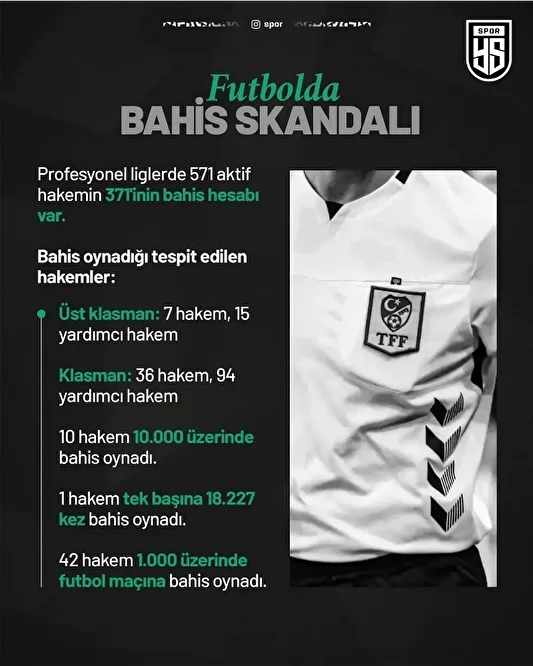Türk futbolunda yeni bir skandal yaşanıyor. Aktif hakemlerin yarısından çoğunun bahis hesabının olduğu ortaya çıktı. 571 hakemin, 371’inin bahis hesabının olduğu ve 152’sinin de aktif bir şekilde bahis oynandığı açıklandı. Bu hakemlerden 7’sinin üst klasman hakemi, 15’inin üst klasman yardımcı hakemi, 36’sının klasman hakemi, 94’ünün klasman yardımcı hakemi olduğu ifade edildi. Bunların içerisinde 10 hakemin 10 binin üzerinde bahis oynadığı, bir hakemin tek başına 18 bin 227 kez oynadığı, 42 hakemin ayrı ayrı binin üzerinde futbol müsabakasında bahis oynadığı, bazı hakemlerin ise tek bir seferlik bahis oynadığı tespit edildi.