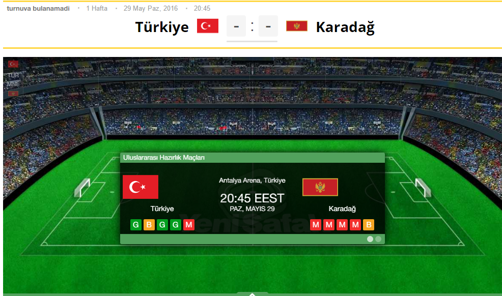 Türkiye, 2016 Avrupa Futbol Şampiyonası hazırlıkları kapsamında Karadağ ile yaptığı hazırlık karşılaşmasını 90+4.dakikada Mehmet Topal'ın attğı golle 1-0 kazandı.