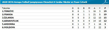 Milliler, ilk 2 sırayı alan takımların Avrupa Şampiyonası'na katılacağı grupta 19 puan ve averajla lider durumda bulunurken, rakip İzlanda 15 puanla 3. sırada yer alıyor. Türkiye'nin liderlik yolundaki en önemli rakibi ve aynı puana sahip Fransa ise sahasında Moldova'yı konuk edecek.