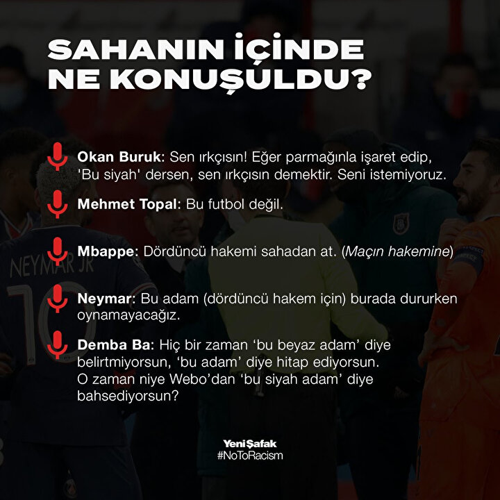 - "Kendi dilinde kötü bir manaya gelmediğini söylese de uluslararası üst düzey bir maçta dikkatli olması gerekirdi. Biz tepki gösterdik ve PSGli oyuncular da destek verdi. UEFA yetkilisi, maçın dördüncü hakeminin maçtan alındığını ve VAR hakemlerinden birinin geleceğini söyledi. Ancak biz kabul etmedik. UEFA ile yaptığımız görüşmeler sonucunda yeni bir hakem dörtlüsü gönderilmesine karar verildi ve maç yarın oynanacak. Paris Saint-Germain’li oyuncular burada bize çok büyük destek verdi, kendilerine teşekkür ediyoruz”