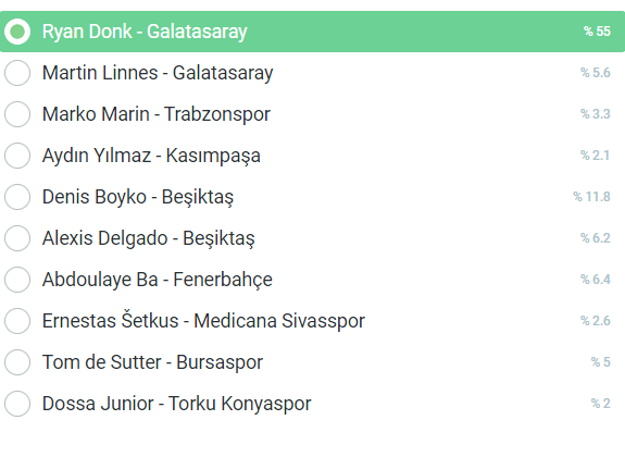 Yüzlerce kişinin oy kullandığı anketimizin birinci sırasında Galatasaray'ın sezon ortasında yaptığı Ryan Donk transferi yer aldı. İkinci sırada Beşiktaş'tan Denys Boyko, üçüncü sırada ise Fenerbahçe'den Abdoulaye Ba da en kötü transferler listesinde kendilerine yer buldu.