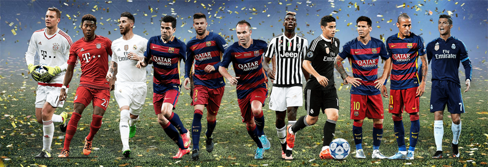 "Neuer (Bayern Münih), Dani Alves (Barcelona), Ramos (Real Madrid), Pique (Barcelona), Alaba (Bayern Münih), Pogba (Juventus), Iniesta (Barcelona), James Rodriguez (Real Madrid), Cristiano Ronaldo (Real Madrid), Messi (Barcelona), Neymar (Barcelona)."