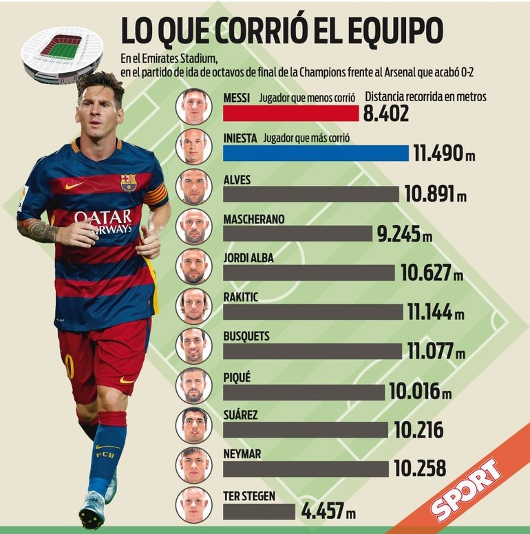 Takımın en az koşan ismi olmasına rağmen maçın adamı olan Messi, “koşmadan da yıldız olunabilir mi?" tartışmasının da fitilini de yakmış oldu. 32 yaşındaki Iniesta bile 11,5 km koşarken, Neymar-Suarez ikilisi 10 km'nin altına inmezken Messi'nin sürekli tasarruf modunda olması ise uzmanlar tarafından “ileri görüşlü" olmasına bağlanıyor.