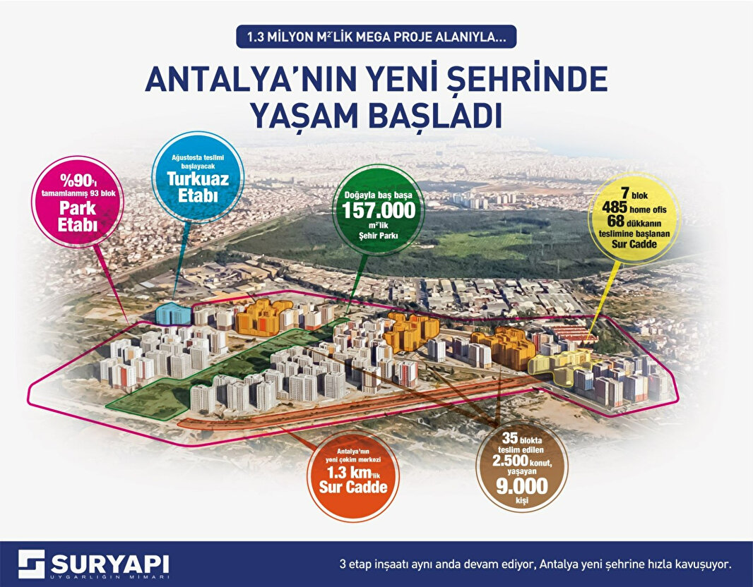 Sur Yapı Yönetim Kurulu Başkanı Z. Altan Elmas, 19 bin bağımsız bölümden oluşan ve 70 bin kişinin yaşayacağı Sur Yapı Antalya projesinin yaklaşık 8500 konutluk kısmında çeşitli etaplar halinde inşaat çalışmalarının devam ettiğini, kaba yapı imalatının yüzde 90’ının bittiğini ve birçok etapta da ince yapı imalatının yüzde 80, yüzde 90 oranlarına eriştiğini açıkladı. Projede bugüne kadar toplam 2 bin 500 konutu teslim ettiklerini anlatan Elmas, kalan konutlarda ise ince imalatların hızla yapıldığını söyledi. Dünyanın dört bir yanından ilgi görmeye devam eden Antalya projesinin inşasına ve konut teslimlerine pandemi boyunca devam ettiklerine dikkat çeken Elmas, “Sur Yapı Antalya projesine başladığımız ilk günden itibaren söylemimiz ‘Bir şehir inşa ediyoruz’ oldu. Bu sözümüzün artık gerçek olduğunu görüyoruz. Sur Yapı Antalya, konutları, parkları, bahçeleri, dükkân ve mağazaları yakında açılacak olan Alışveriş Caddesi ve halihazırda 9 binin üzerindeki sakiniyle şimdiden yaşayan bir şehir haline geldi” dedi.