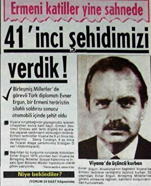 Viyana'da Birleşmiş Milletler Teşkilatı'nda (BM) bir Tük diplomat olarak hizmet veren Evner Ergun, 19 Haziran 1984'te "Ermeni Devrimci Ordusu"nun otomobiline koyduğu bomba ile öldürüldü.