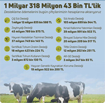 Tarım ve Orman Bakanı Vahit Kirişci "1 milyar 318 milyon 43 bin liralık tarımsal destek ödemelerini bugün çiftçilerimizin hesaplarına aktarıyoruz. Hayırlı ve bereketli olsun" müjdesini verdi.