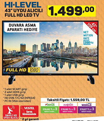 HI-LEVEL 43 İNÇ UYDU ALICILI FULL HD LED TV ÖZELLİKLERİ!