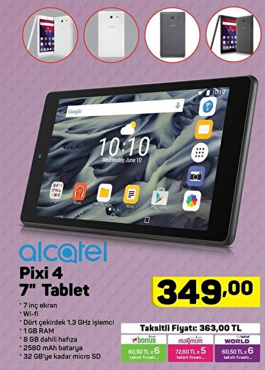 ne eklediği Alcatel Pixi 4 7 inç tablet ile ürün yelpazesini her geçen gün genişletmeye devam ediyor. Online alışveriş sitesinde de aktüel ürünler listesine eklediği ürünleri satışını sürekli haline getiren marketler zinciri, müşterilerinin uygun fiyatlı ürünlere ulaşmasını kolaylaştırdı.
