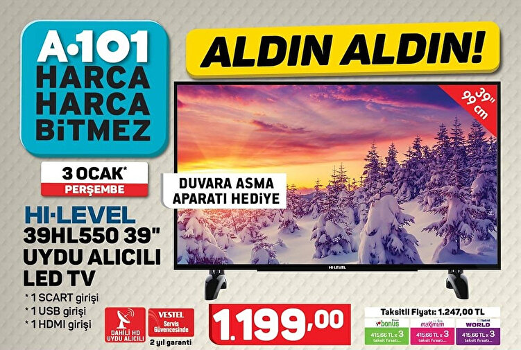 nde Hı Level 39LH550 39 inç uydu alıcılı LD TV, Honor 7C ve Alcatel Pixi 4 7 inç tablet ile dikkatleri üzerine çekmeyi başarıyor. Yeni yılda da aynı fiyatlar ve indirimler ile müşterilerinin karşısına çıkmaya devam eden marketler zinciri, bu yıla zam yaparak girmedi.