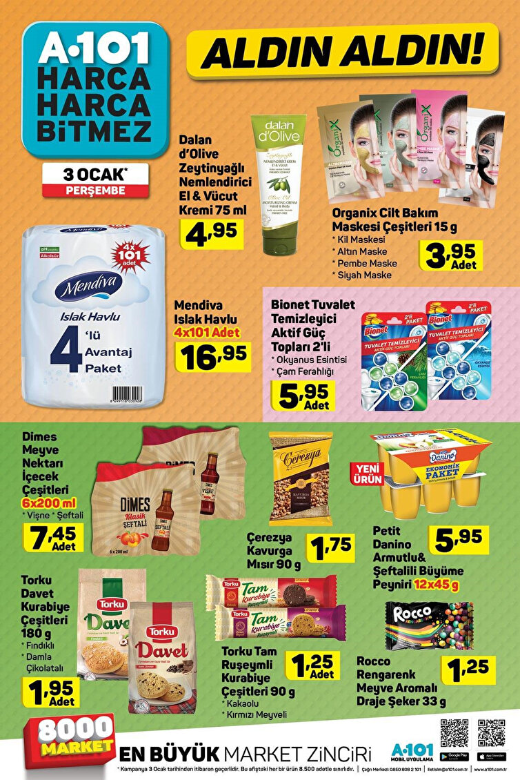 nu tam sayfa yayınladı. Yeni yılla birlikte yine yeni ürünlerini indirimli fiyat etiketi ile satışa sunmaya devam eden A101, ürünlerine zam yapmadan aynı fiyat üzerinden satmaya devam ediyor.