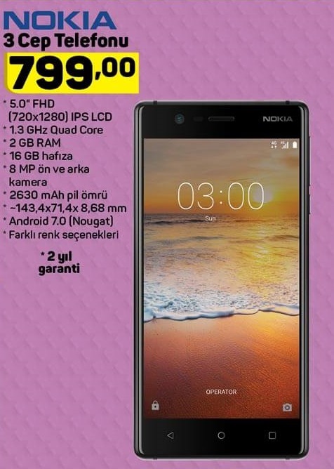 Piyasada 950 TL fiyat etiketi ile satışa sunulan Nokia 3, A101 30 Ağustos aktüel ürünler listesinde 799 TL fiyat etiketi ile satışa sunulacak. Piyasa fiyatının çok altında satışa sunulan cihaz, yeni telefon alacak veya telefonunu yenilemek isteyenler için ciddi bir fiyat avantajı sağlayacak.