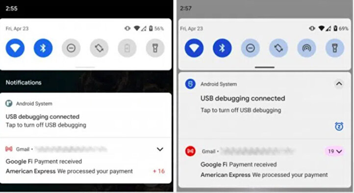 ile birlikte bildirimleri genişleterek görmek için sağ üst köşeye yeni bir simge yerleştiriliyor. Tabii buna ek olarak bildirim sayısı veya arka plan rengi de vurgulanıyor. Böylece çok daha hoş bir görünüm ve kullanışlı bir arayüze ek olarak bildirimlerin kapladığı alan da revize edilmiş oluyor.