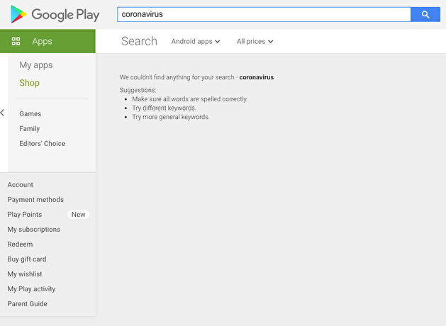 Google Play'de ise durum daha sert. Koronavirüs kelimesi yazıldığında sonuç dahi çıkmıyor.