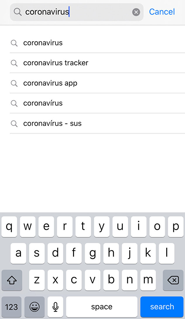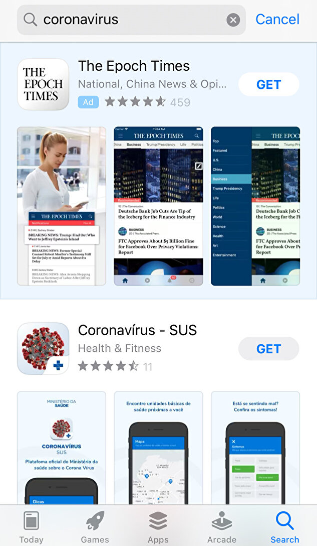 App Store'da hızlıca "koronavirüs" araması yapıldığında ekrana birçok uygulama düşüyor. İlk sonuç ücretli bir reklamken ikincisi Brezilya Sağlık Bakanlığı'ndan sağlık bildirimleri düşüren uygulama.