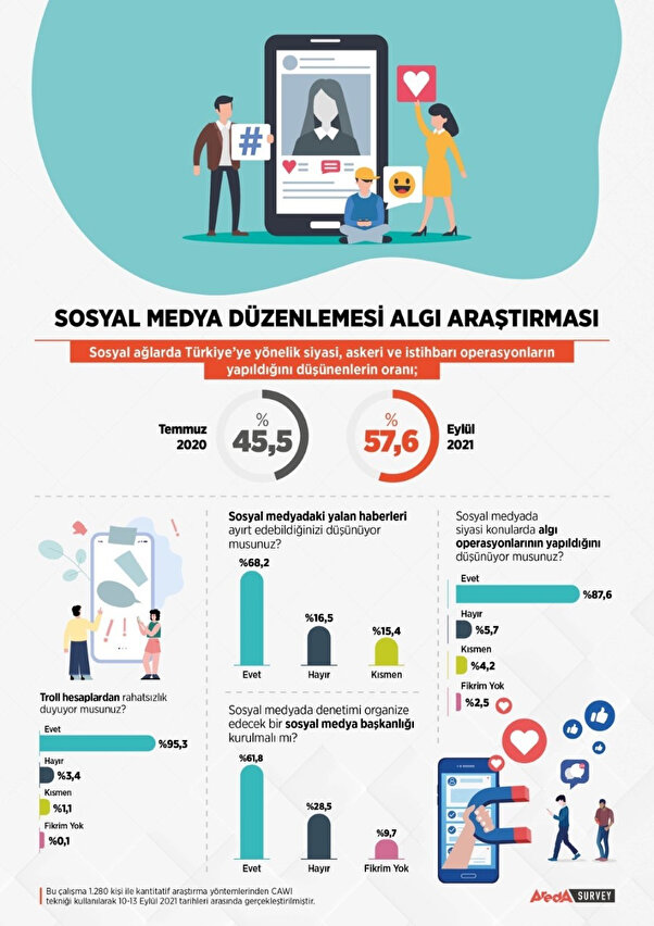 Araştırma şirketi Areda Survey, 10-13 Eylül tarihleri arasında 'Sosyal Medya Algı Araştırması' gerçekleştirdi. Bin 280 kişinin katıldığı araştırma kantitatif araştırma yöntemlerinden CAWI (Bilgisayar Destekli Web Anketi) ile yapıldı. Araştırmada, vatandaşın sosyal medya düzenlemesine bakışına dair çarpıcı sonuçlar ortaya çıktı.