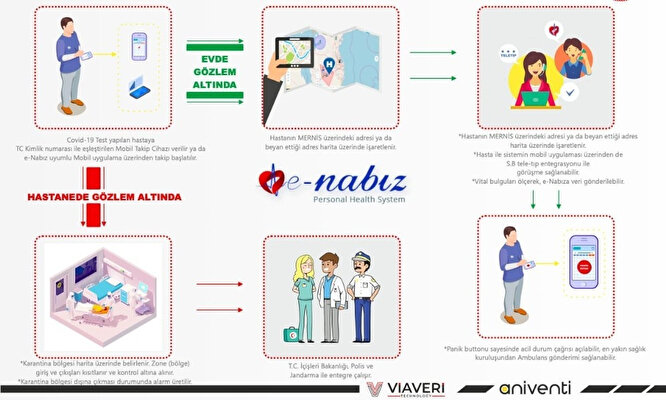 Ankara Kalkınma Ajansı’nın millileştirme projesi olan Yerli Tedarik ve İşbirliği Platformu’nda yer alan ve Hacettepe Teknokent’de Ar-Ge çalışmalarını sürdüren Aniventi ile Viaveri tarafından geliştirilen pandemi yönetim sistemi sayesinde renk ile sınıflandırılacak kişiler ve en son bulundukları, alışveriş yaptıkları, gezdikleri tüm yerler tespit edilip, oradaki kişilere de sistem üzerinden hızlıca bildirimler gönderilebilecek. Herkes en yakın sağlık kuruluşu ile önce uzaktan, akabinde semptomlar eğer Covid-19 bulgularını gösteriyorsa direkt giderek yayılmanın önüne hızlıca geçilecek. Uygulama sayesinde bulguları şüpheli olan ve kendisini iyi hissetmeyen vatandaşlar panik butonu sayesinde acil çağrı açabilecek ve Covid-19 donanımlı ambulanslar ile en yakın korona tedavi sağlık kuruluşuna götürülecek. Temas edilen her kişi ve her lokasyon sisteme otomatik olarak eklenecek ve o lokasyondaki kişilere anlık bildirimler ve Covid-19 tedavi ve korunma önerileri gidecek.