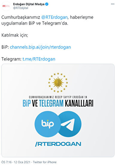 Erdoğan, BİP uygulamasında "https://channels.bip.ai/join/rterdogan" adresinden, Telegram uygulamasında ise "https://t.me/RTErdogan" adresinden takip edilebilecek.