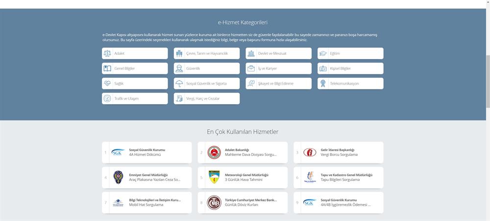 Bununla birlikte biraz daha aşağıya inildiğinde kullanıcılara hizmet kategorileri ve sık kullanılan işlemler listesi sunuluyor. Genel manada herkesin en çok kullandığı hizmetler
