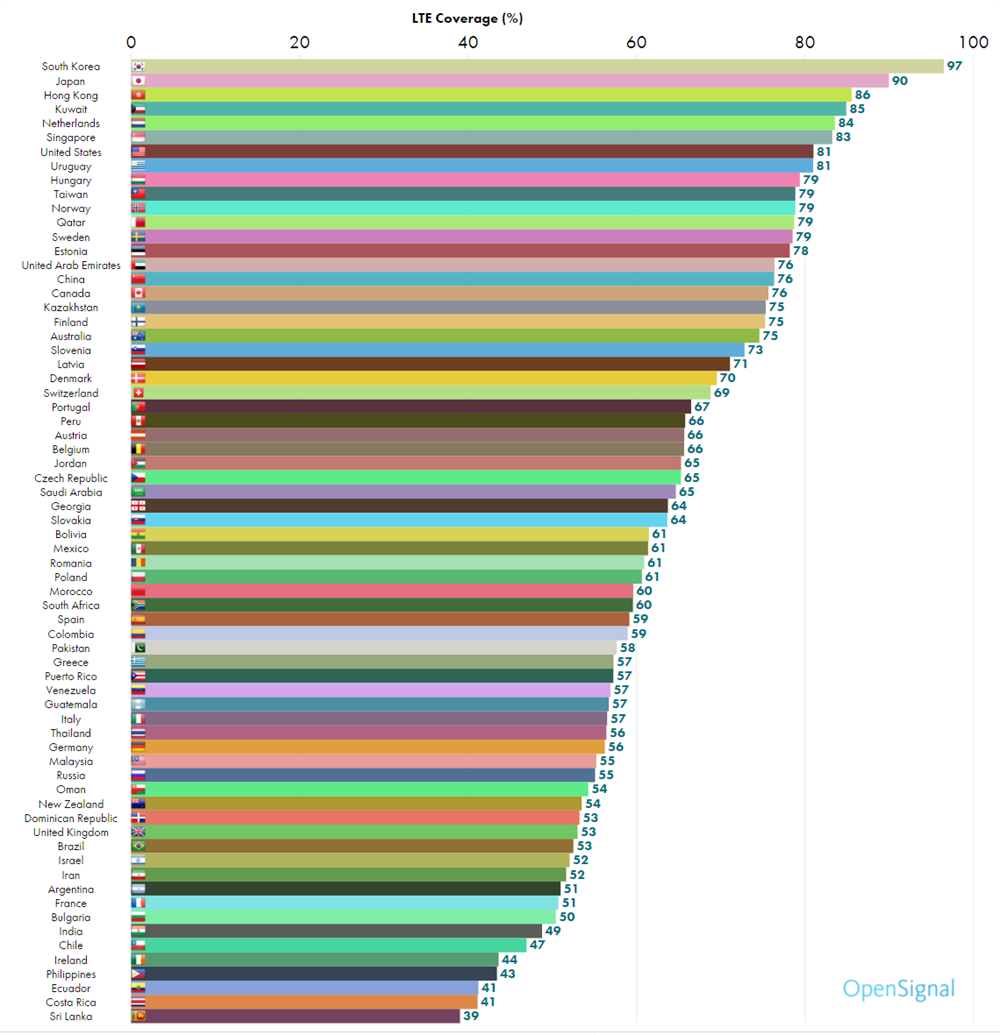 Bir diğer önemli kıstas olan kapsama alanında ise lider %97 G. Kore. Yani bunun anlamı ülkenin neredeyse tamamının 4G kapsamında bulunması. İkinci sırada ise %90 ile