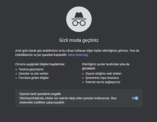 - - Chrome, göz atma geçmişinizi, çerezleri ve site verilerini veya formlara girilen bilgileri kaydetmez. - İndirdiğiniz dosyalar ve oluşturduğunuz yer işaretleri tutulur.- Etkinliğiniz ziyaret ettiğiniz web sitelerinden, işvereninizden veya okulunuzdan ya da internet servis sağlayıcınızdan gizlenmez.