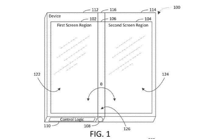 Üç ekranlı olarak bahsediyoruz ancak üçüncü ekran biraz farklı şekilde konumlandırılmış. Cihazın iki ekranının ortasındaki menteşe kısmına yerleştirilmiş. Üçüncü ekran alanı aşağıdaki fotoğrafta 106-108 ile numaralandırılan bölgede yer alıyor.