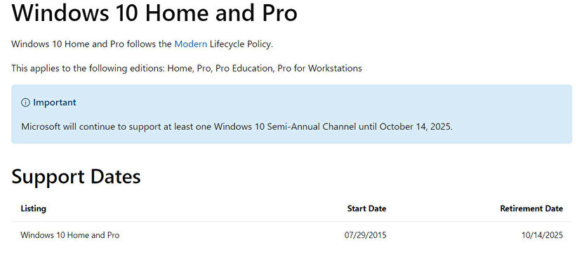 Microsoft, Windows 10 için desteğin resmi olarak 14 Ekim 2025'te sonlanacağını duyurdu. Bilgiler, Home, Pro, Enterprise ve Educations sürümleri için geçerli. Söz konusu tarihten sonra Windows 10 işletim sistemi çalıştıran cihazlar artık güvenlik ve diğer güncellemelerin hiçbirini alamayacak.