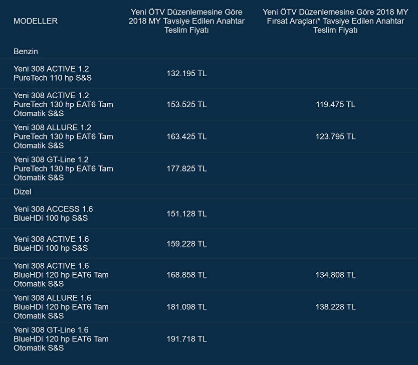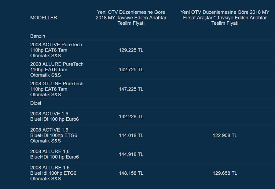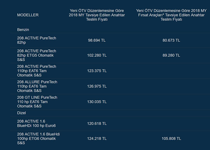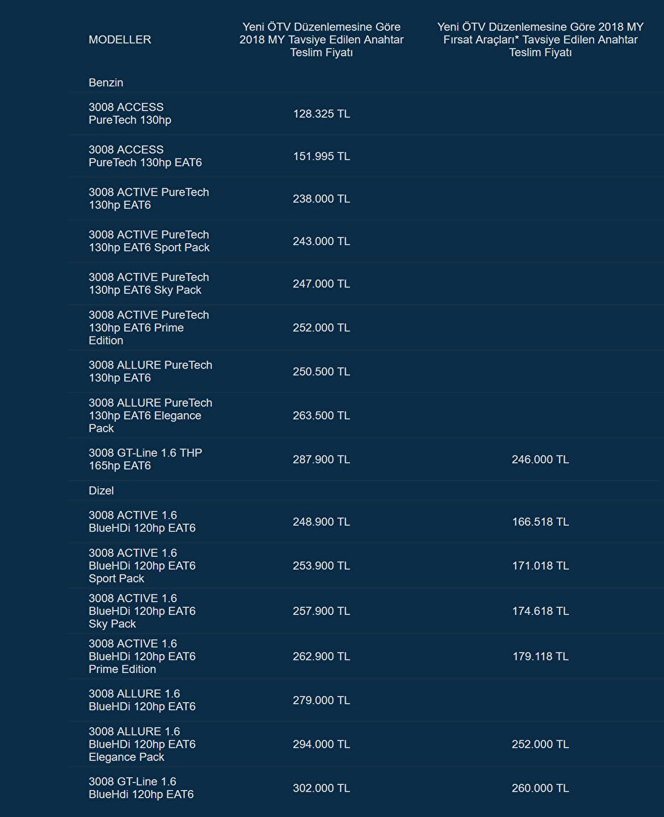 ÖTV ve KDV indirimlerinde ilk hamle Peugeot’dan geldi. Kararın Resmi Gazate’de yayınlanmasının ardından kolları sıvayan Fransız otomotiv devi Peugeot, tüm yeni modellerine 21.000 TL’ye varan indirim yaptı. ÖTV ve KDV indirimi sonrası yeni Peugeot modellerinin fiyatlarını sizler için derledik. İşte ÖTV ve KDV indirimli sıfır ve ikinci el Peugeot modellerinin yeni fiyatları...