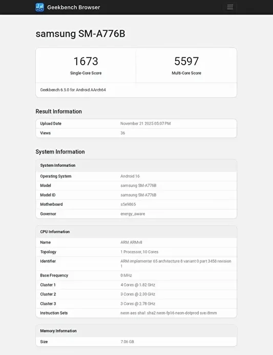 Paylaşılan test sonuçlarına göre Galaxy A77, Geekbench’te tek çekirdekte 1.673, çok çekirdekte 5.597 puan almayı başarıyor. Bu skor, işlemcinin Exynos 2400’ün daha düşük frekanslı bir türevi olabileceğini gösteriyor.