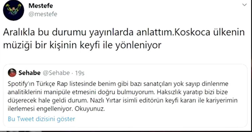 Online müzik dinleme platformu olarak bilinen Spotify ile ilgili iddialar ortada büyük bir skandal olduğunu gösteriyor. Ünlü rapçiler; Sehabe, Şehinşah gibi isimler platformdaki listelerin bir editörün keyfine göre oluşturulduğunu belirtirken Nazlı Yırtar isimli editörün daha önce köşe yazıları yazdığı sitede kullandığı tabirler PKK sempatizanı olduğu iddialarının ortaya atılmasına sebep oldu. Spotify'daki dinlenme rakamları ile rap listelerinde bir numaraya kadar çıkan; Ezhel, Mero gibi isimlerin prodüktörü olarak bilinen Hüseyin Baybaşin'in hackerlara para verip algoritma ile oynadığı da iddialar arasında.