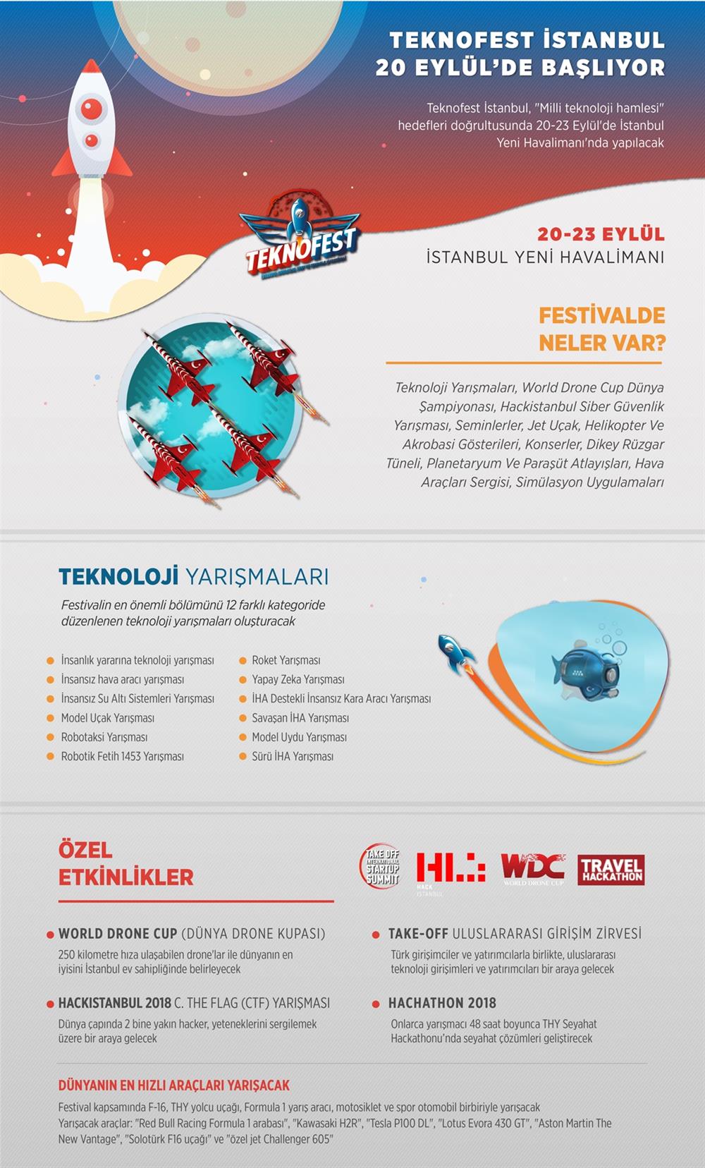 Türkiye'nin ilk havacılık, uzay ve teknoloji festivali olan Teknofest İstanbul, Türkiye Teknoloji Takımı (T3 Vakfı) ve İstanbul Büyükşehir Belediyesi tarafından 20-23 Eylül'de İstanbul Yeni Havalimanı'nda düzenlenecek. Festivalin detaylı takvimi sosyal medyada paylaşıldı.