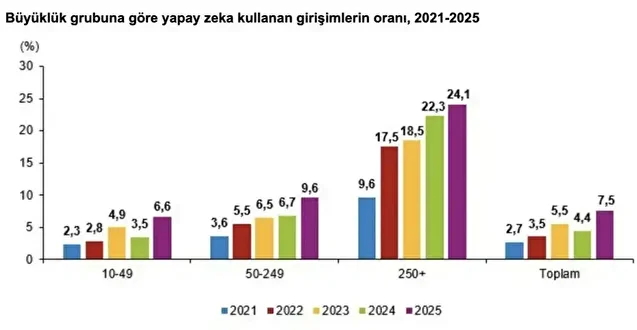 Yapay zeka teknolojilerinden herhangi birini kullandığını belirten girişimlerin oranı, 2021 yılında yüzde 2,7 iken bu oran 2025 yılında yüzde 7,5 oldu. Yapay zeka kullanan girişimler çalışan sayısı büyüklük grubuna göre incelendiğinde; 2025 yılında 10-49 çalışanı olan girişimlerin yüzde 6,6'sının, 50-249 çalışanı olan girişimlerin yüzde 9,6'sının ve 250 ve üzeri çalışanı olan girişimlerin yüzde 24,1'inin herhangi bir yapay zeka teknolojisi kullandığı görüldü. Bu oranlar, 2021 yılında 10-49 çalışanı olan girişimlerde yüzde 2,3, 50-249 çalışanı olan girişimlerde yüzde 3,6 ve 250 ve üzeri çalışanı olan girişimlerde yüzde 9,6 idi.