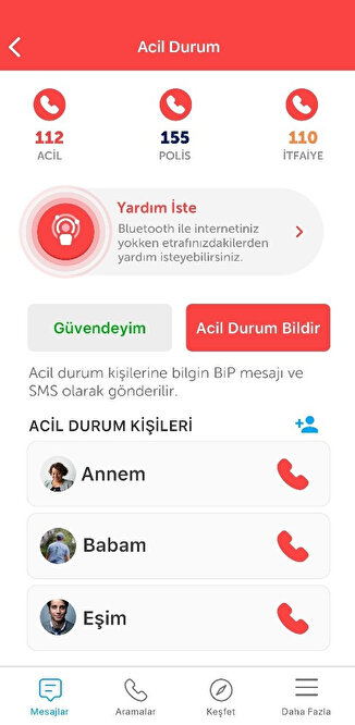 BiP Acil Durum Butonu 'Yardım İste' özelliğimiz ise şimdi de bluetooth bağlantısı üzerinden kullanıcılarına etrafındaki kişilerden sesli ve yazılı olarak yardım isteyebilme imkanı tanıyor. Bu özellik ile acil ve doğal afet durumlarında daha fazla vatandaşımızın güvende kalmasını sağlamayı amaçlıyoruz."