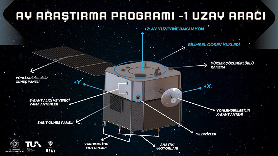 Türkiye Uzay Ajansının (TUA) hazırladığı Milli Uzay Programı içinde yer alan "Ay Araştırma Programı-1 (AYAP-1)" için tasarlanan uzay aracına ait ilk detaylar paylaşıldı. Uzay aracı görselinin yer aldığı paylaşımda, yönlendirilebilir güneş paneli, S-Bant alıcı ve verici yama antenler, sabit güneş paneli, yardımcı itki motorları, ana itki motorları, yıldızizler, yönlendirilebilir X-Bant anteni, yüksek çözünürlüklü kamera gibi bileşenler gösterildi.