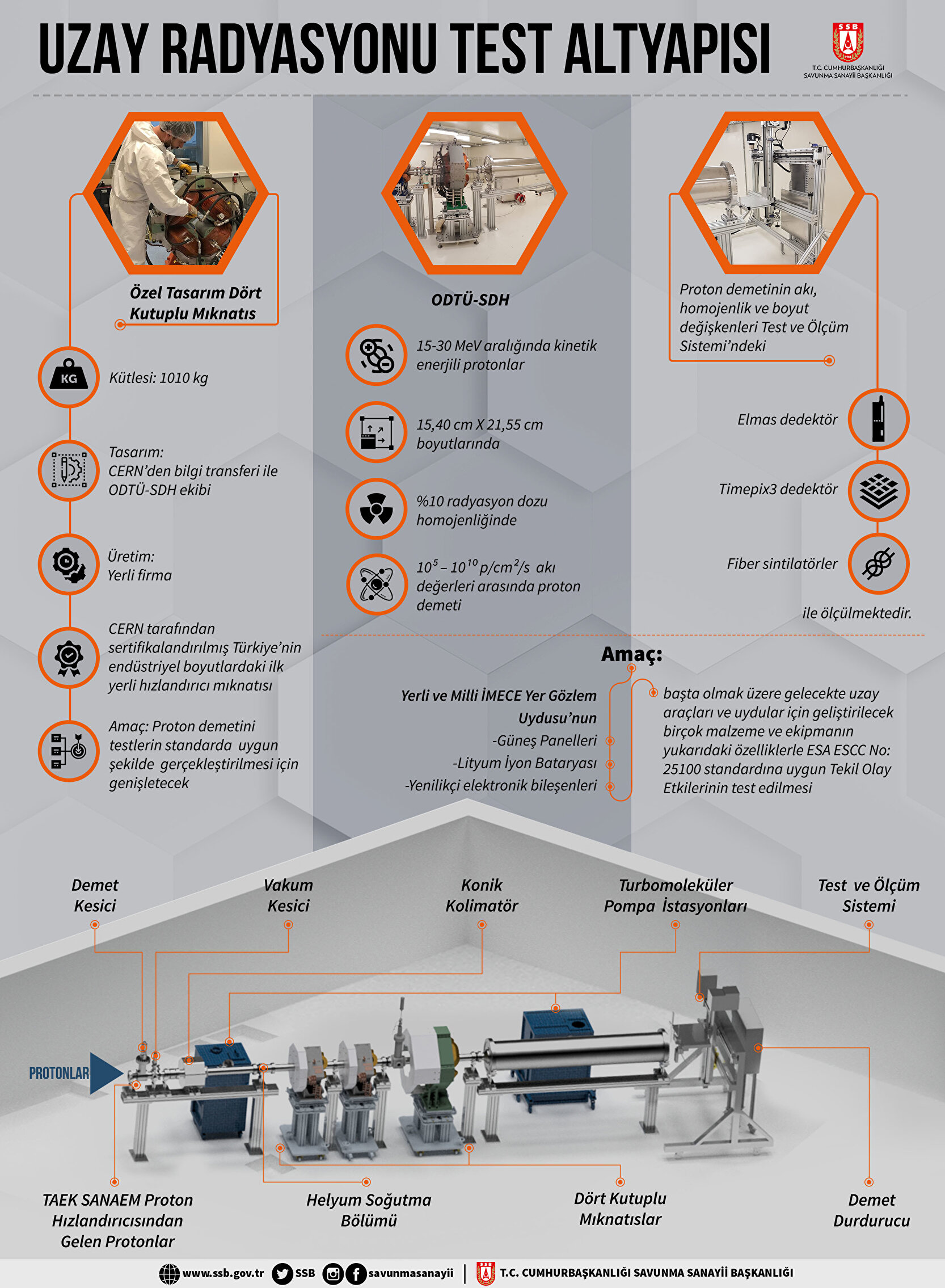 Alınan bilgiye göre, Cumhurbaşkanlığı Savunma Sanayii Başkanlığı tarafından yürütülen Türkiye'nin ilk Parçacık Radyasyonu Test Altyapısı'nın kurulumu gerçekleştirildi. Test altyapısı ile kritik uydu bileşenlerinin, uzaya gönderilmeden önce oradaki radyasyon ortamına karşı dayanıklılığının test edilmesi ve böylece bu alanda dışa bağımlılığın azaltılması amaçlanıyor.