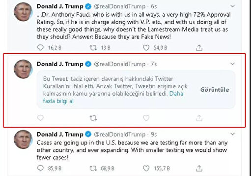 Sosyal medya platformu Twitter, ABD Başkanı Donald Trump'ın, ırkçılıkla ilgili "yalan haberler" konusunda paylaştığı videoya, "manipüle edilmiş medya" etiketi ekledi. Twitter, bugün ise başka bir tweete de 'şiddet içeriyor' uyarısı koydu. Donald Trump'ın en sevdiği platform olan Twitter hesabı bir anlamda basın sözcüsü gibi çalışıyordu. Twitter, dünyanın bu platformu en aktif kullanan lideri olan Trump'ın bam teline bastı.