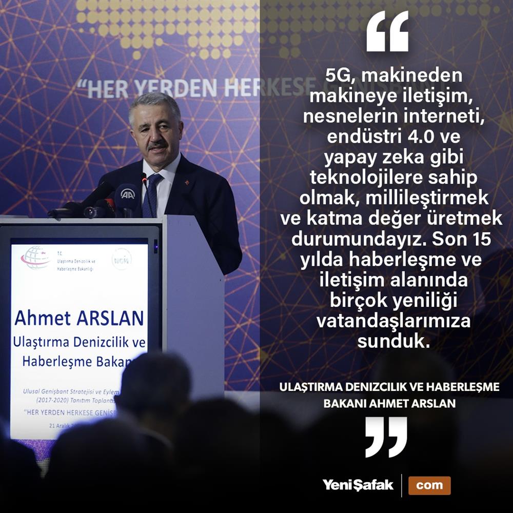 Ulaştırma, Denizcilik ve Haberleşme Bakanı Ahmet Arslan, "Kurulacak olan Genişbant Stratejisi İzleme Kurulunun katkıları ile de 2023 hedeflerimiz doğrultusunda stratejimizdeki ana hedef olan her yerden herkese genişbantı sağlayacağız" dedi.