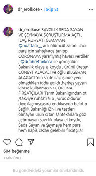 ‘’Savcılık Seda Sayan ve Şeymaya soruşturma açtı, ilaç ruhsatı olmayan @noattack_ adlı ölümcül zararlı ilacı para için sahtekarca tanıtıp coronaya yararlıymış havası verdiler, @drfahrettinkoca ile görüşüldü. Bakanlık olaya el koydu, ürünü üreten Cüneyt Alacacı ve oğlu Bilgehan Alacacı’nın sahte ilaç işinde yeni olmadıkları iddia edildi. Herkes yaysın kimse kullanmasın! Corona fırsatçıları, Tarım Bakanlığından ot / takviye ruhsatı alıp virüsü öldürür diye ilaçmışcasına endikasyon belirtip Sağlık Bakanlığı izni ve testleri olmayan ürün satan sahtekarlara göz açtırmayan savcılık olaya el koydu. Seda Sayan ve Şeyma'ya hem para hem hapis cezası gelebilir fırsatçılar her an yurt dışına kaçabilir! Dikkat et ve yay!”