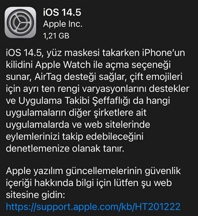 iPhone kullanıcılarının uzun süredir beklediği iOS 14.5 güncellemesi nihayet yayınlandı. Pil kalibrasyonu, uygulamaları hızlıca kapatma ve gizli takibi engelleme gibi özelliklerin sunulduğu yeni sürümde maske takan kullanıcıların Apple Watch ile iPhone kilitlerini açmasını sağlayan bir sistem de yer alıyor.