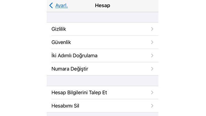 Hesap ayarları sayfası üzerinden gizlilik, güvenlik, iki adımlı doğrulama, numara değiştirme ve hesap silme gibi hesabınız ile ilgili önemli değişiklikleri yapabilirsiniz. Hesap bilgileri raporu için ise Hesap Bilgilerini Talep Et seçeneğine dokunmalısınız.