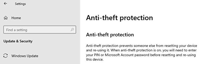 - Hırsızlığa karşı koruma, başka birinin cihazınızı sıfırlamasını ve yeniden kullanmasını engelliyor. Hırsızlık koruması açık olduğunda, bu cihazı sıfırlamadan ve yeniden kullanmadan önce PIN veya Microsoft hesap şifrenizi girmeniz gerekecek.