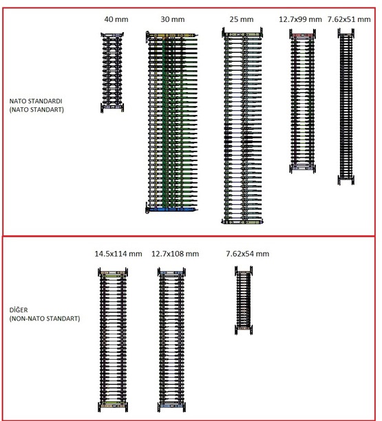 Ürün ailesindeki 5 kalibre (7,62, 12,7, 25, 30 ve 40 milimetre) NATO mühimmatlarına uygun olarak tasarlandı ve üretildi. Aileyi tamamlayan 7,62x54, 12,7x108 ve 14,5x114 milimetre kalibrelik ürünler ise Rus mühimmatlarına göre tasarlandı.
