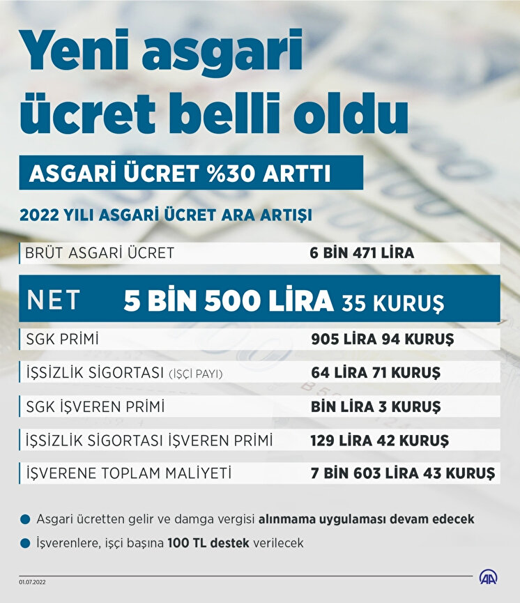 - "Bakanlığımızın tüm taraflarla görüş ve anlayış birliği içinde yürüttüğü çalışma sonunda yeni bir asgari ücret rakamı belirledik. Şimdi sizlere yeni asgari ücreti açıklamak istiyorum. Asgari ücrete temmuz ayından geçerli olmak üzere yüzde 25 oranında bir ara artış yapıyoruz. Buna göre yeni asgari ücret net 5 bin 500 lira olacaktır. İşçi başına devletimiz işverenlere de 100 lira destek verecektir."