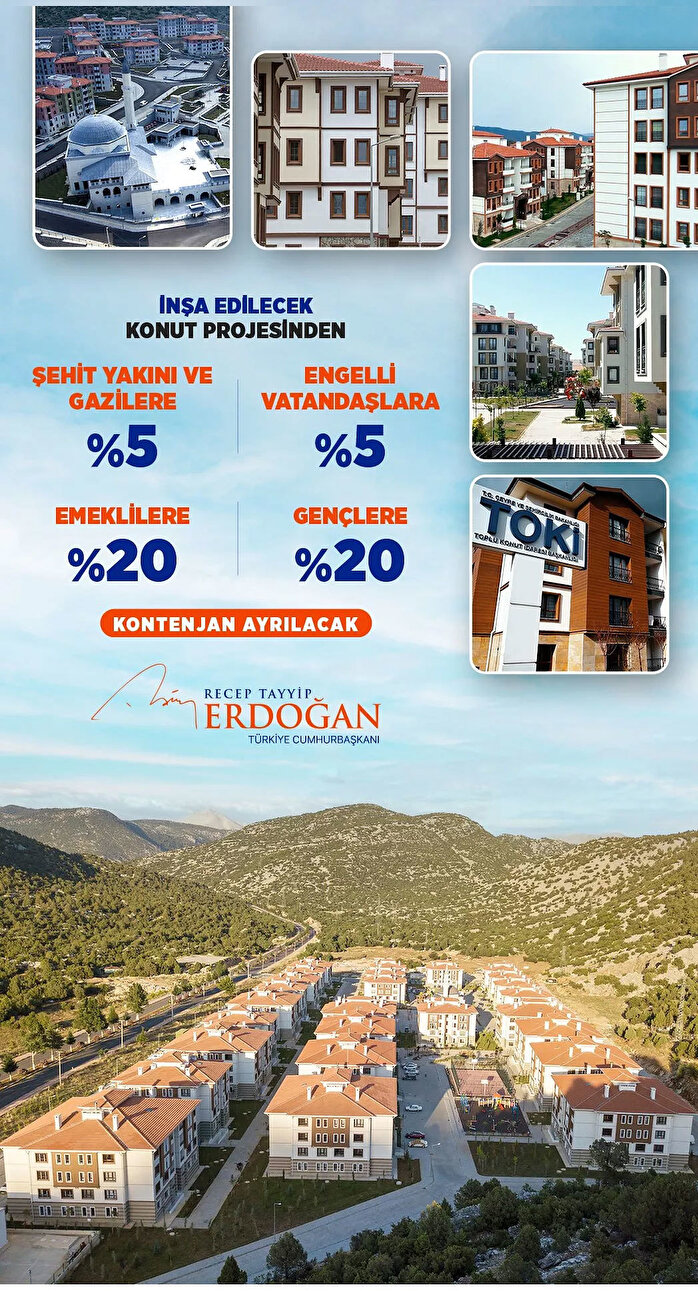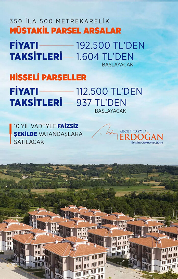 Cumhuriyet tarihinin en büyük sosyal konut projesini açıklayan Cumhurbaşkanı Recep Tayyip Erdoğan, dar gelirli vatandaş için, 5 yılda 500 bin konut, 250 bin altyapılı arsa ve 50 bin işyerinin satışa sunulacağını söyledi. Konutta fiyatlar 608 bin TL, taksitler 2 bin 280 TL’den başlayacak. Dar gelirli vatandaş 112 bin 500 TL’den başlayan fiyatla arsa, 350 bin TL’den başlayan fiyatla işyeri sahibi olacak.