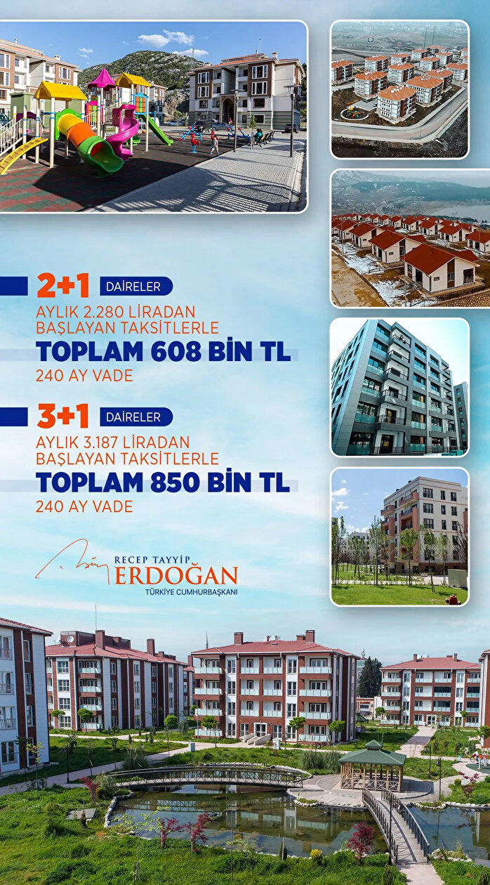 “Vatandaşlar toplamda 608 bin TL fiyata sahip 2+1 konutlara 2 bin 280 TL’lik taksitlerle, 240 ay vade ile sahip olacak. Toplam 850 bin TL fiyata sahip 3+1 konutların ödemesi 3 bin 187 TL’den başlayan taksitlerle 240 ay vadeyle yapılabilecek.”