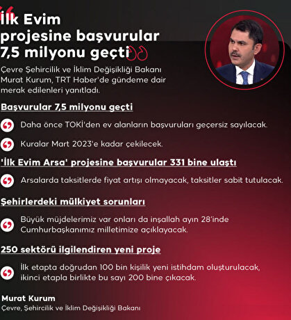 - Toplu Konut İdaresi (TOKİ) Başkanı Ömer Bulut, A Para canlı yayınında önemli açıklamalarda bulunmuştu. Bulut, "Şu ana kadar projeye 7.5 milyon başvuru oldu. Başvuru bedelleri kuralar çekildikten sonra iade edilecek. Evi olanlar konut ve arsaya başvuramaz. 31 Ekim'den sonraki ilk haftada kura çekimleri başlayacak” demişti