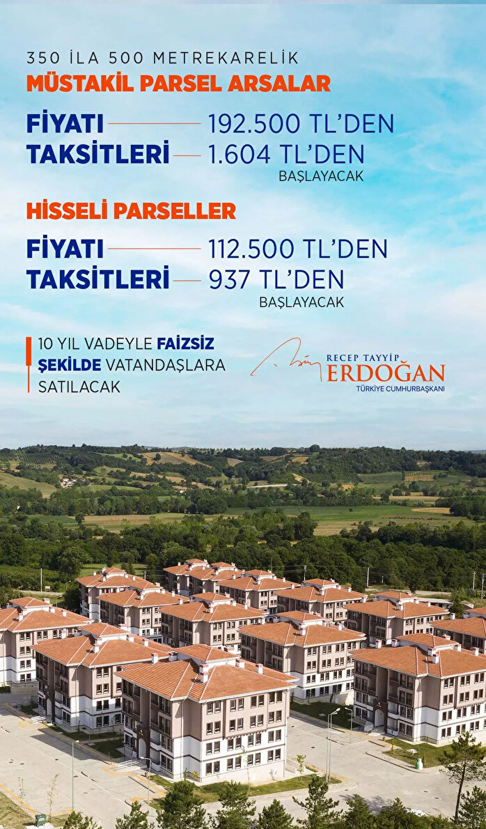 Müstakil parsel arsalar: İlk grupta olan ve fiyatı 192 bin 500 lira olan müstakil parselli arsaların aylık taksidi 1604 TL olacak ve 10 yıl vadeyle ödenecek.