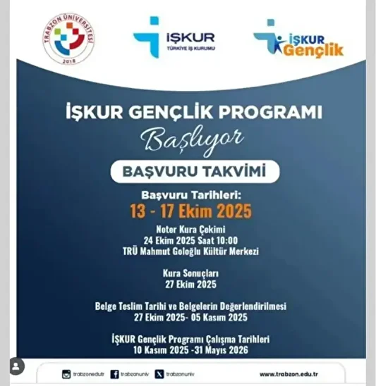 Trabzon Üniversitesi İŞKUR Gençlik Programı başvuruları 13-17 Ekim 2025 tarihleri arasında yapılacak.