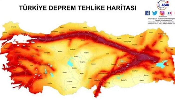 Türkiye'de Kuzey Anadolu Fay Hattı ve Doğu Anadolu Hattı ve Batı Anadolu fay hattı olmak üzere toplamda 3 büyük fay hattı bulunuyor.. Deprem haritasında kırmızı renkte görülen iller birinci derece deprem bölgesi, pembe renke olanlar ikinci derece riskli bölge, sarı olan iller üçüncü dereceden deprem bölgesi olarak geçiyor. İşte birinci dereceden deprem bölgesi olan iller;