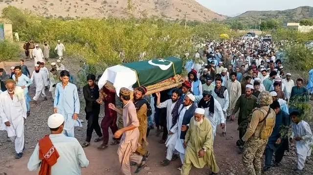 افغان ریڈ کریسنٹ سوسائٹی کے ارکان پاکستان کے سیکیورٹی اہلکاروں کے تابوت ایمبولینس میں منتقل کر رہے ہیں تاکہ قندھار صوبہ سے پاکستان تک پہنچائے جا سکیں۔
